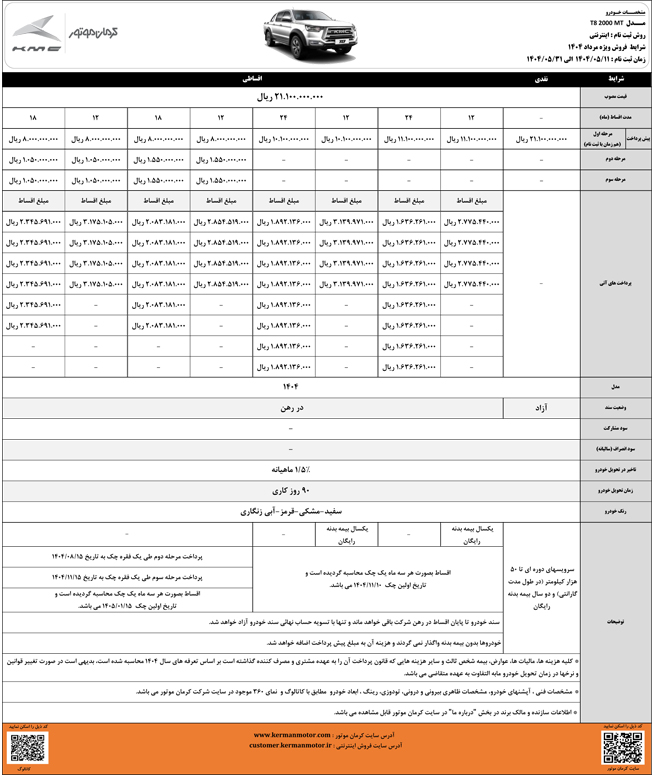 به گزارش سرمایه ملی، بر اساس شرایط فروش اعلامشده، خودرو KMC T8 با قیمت مصوب ۲میلیارد و ۱۱۰میلیون تومان عرضه میشود و متقاضیان میتوانند از شرایط پرداخت متنوع و امکان خرید اقساطی بهرهمند شوند.