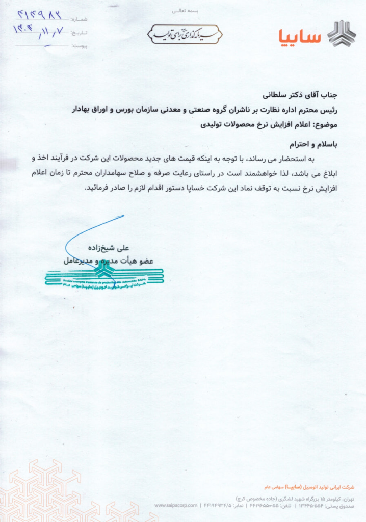به گزارش سرمایه ملی، سایپا در نامهای به رییس اداره نظارت بر ناشران گروه صنعت و معدن سازمان بورس، از فرآیند افزایش و ابلاغ قیمت محصولات این شرکت خبر داده است.